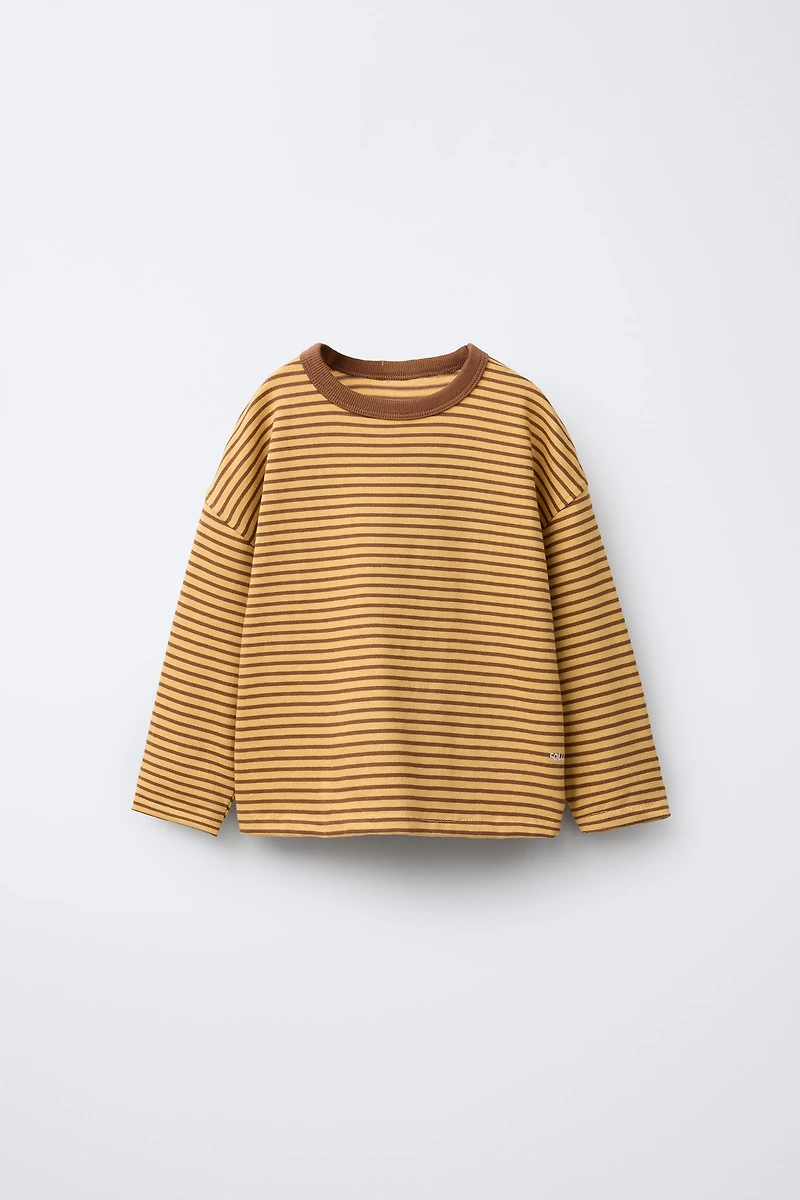 Long sleeve T-shirt with contrasting color ribbed crew neck. Embroidered text detail on the side. Striped print.