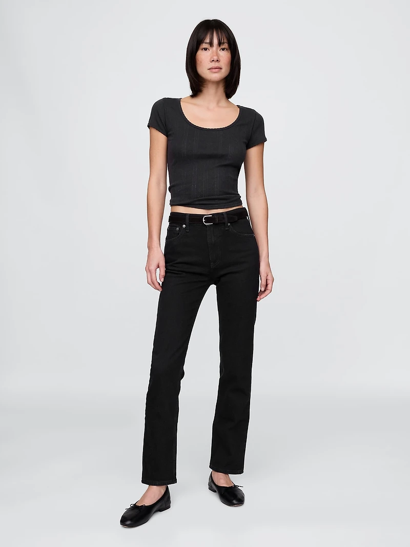 Fit: A full-length classic straight-leg jean that's slim through the hip & thigh. Fabric: 83% Cotton, 11% Polyester, 5% Recycled Materials, 1% Stretch. Stretch: High Stretch. Innovative stretch with high recovery. Made to move & always bounces back. ​ Rise: High Rise Jeans. Look: A classic five-pocket jean in black denim wash. Details: Zip fly, five-pocket styling & holds-you-in front pockets. ​ Responsibly Made: This pair of jeans is part of our water-saving Washwell program. Compared to conventional wash methods, Washwell has saved millions of liters of water since 2016. Also available in Curvy.