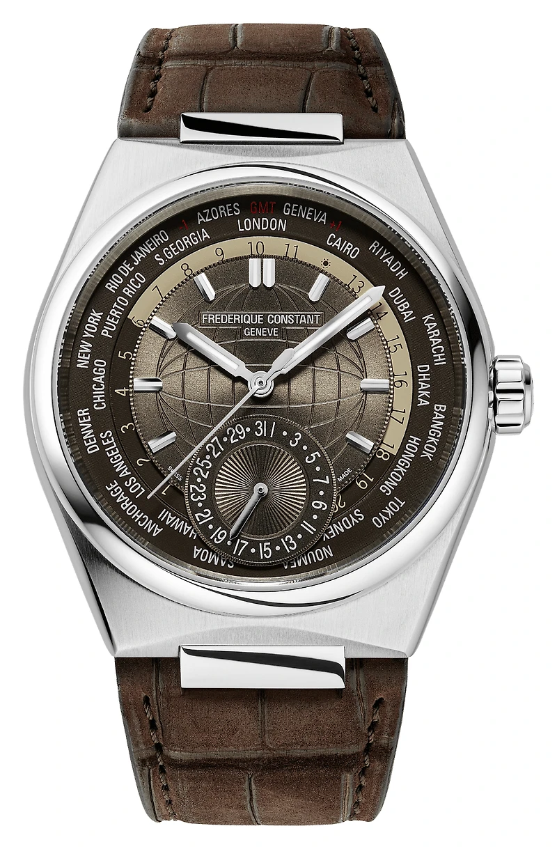 Frederique Constant Highlife Worldtimer Manufactuer 41mm stainless steel automatic watch featuring a brown dial with globe decoration and applied indexes, 24hr disc with day (Ecru) & night (brown) indication and city disk with 24 cites. Presented on a brown sueded alligator strap and includes and additional brown rubber strap and stainless steel bracelet. Water resistant to 10ATM/100M. Sapphire crystal.