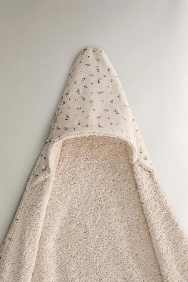 HOODED BABY BATH TOWEL WITH FLORAL PIPING AND HOOD