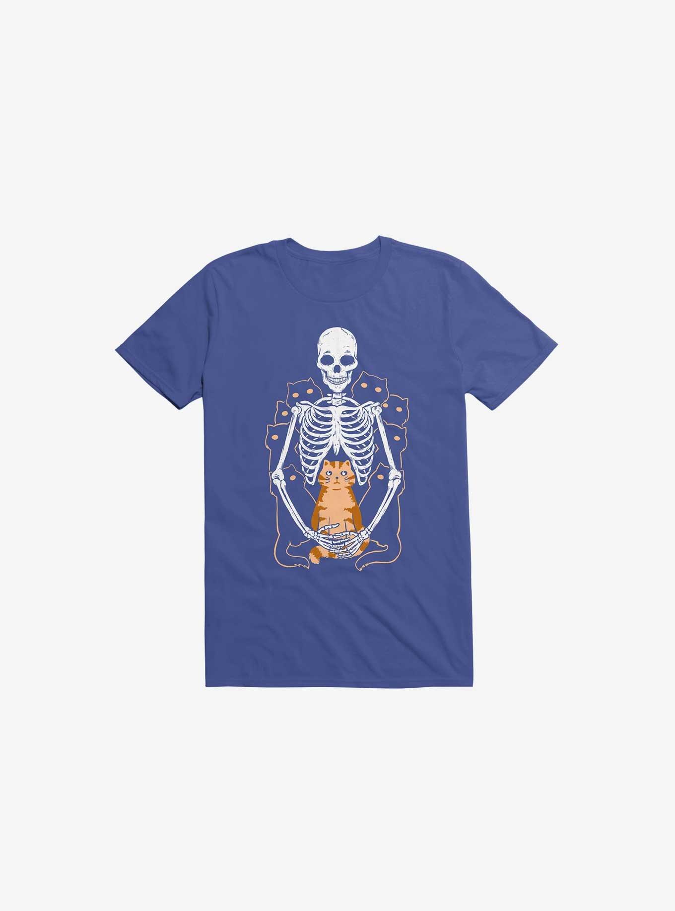 Fur and bone. This lightweight royal blue graphic tee features a skeleton who really, really loves cats. (Maybe just a lil too much.) Officially licensed art from winterglaze.