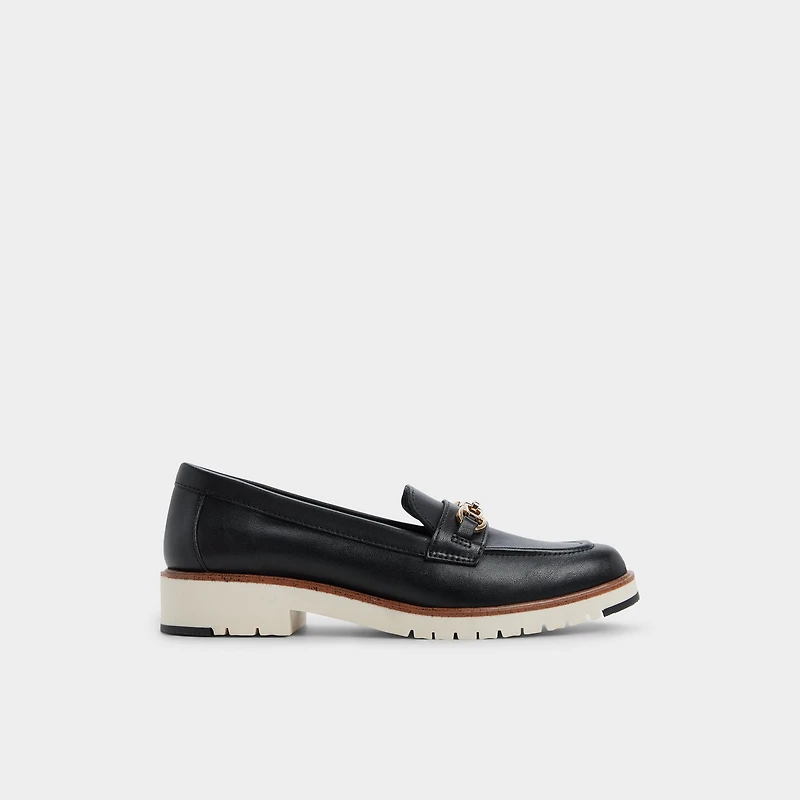 Two-tone lug sole updates the classic leather loafer, adding sporty edge to smooth black uppers and polished gold buckle while hidden cushioning keeps it comfortable. Pair with cropped trousers for work confidence or ground a pleated mini when gallery hops call.