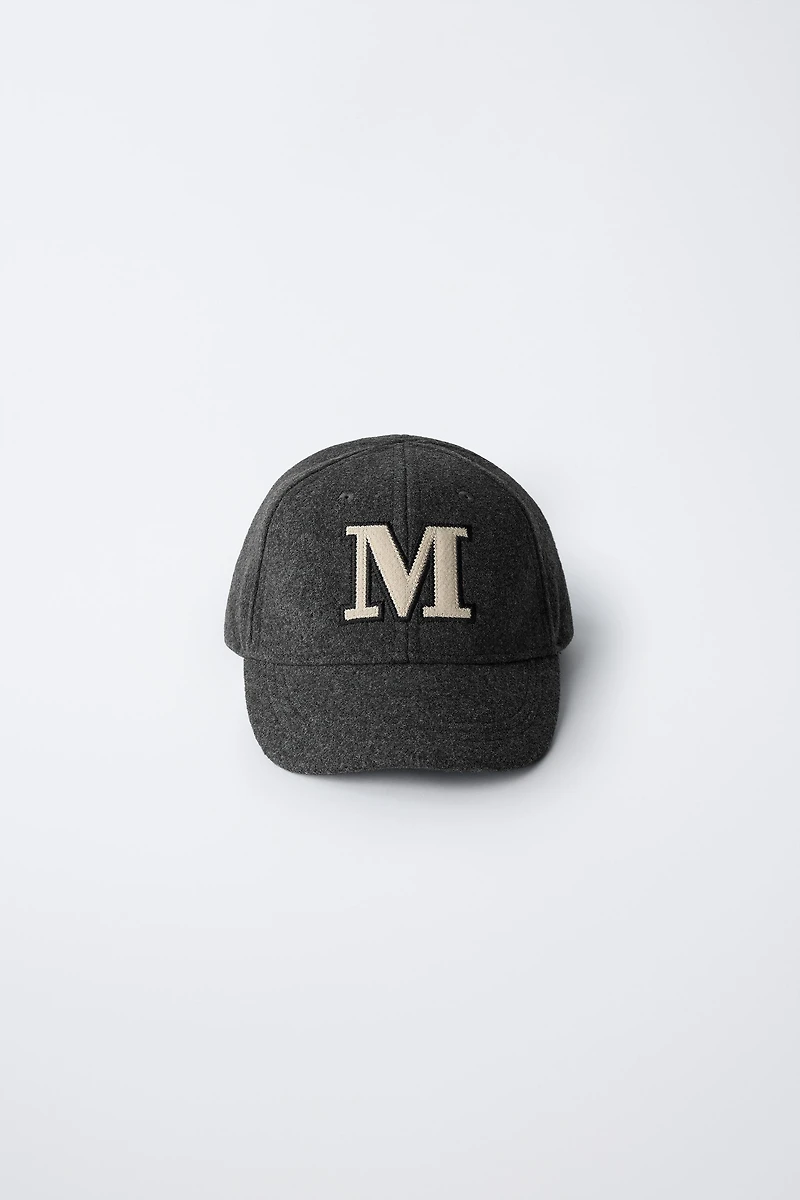 Cap with adjustable hook-and-loop closure at back. Embroidered initial appliqué on front.