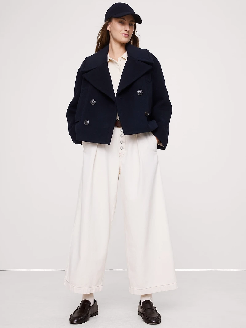 A very cool peacoat. We cut this one from our Italian melton wool-blend, so it'll last for years to come. Plus, we kept the fit easy and a little short, as an invitation to play with proportions. Oversized fit: Extra room through chest, shoulders, and waist. Dropped shoulder seams. Fabric from Italy's Manifattura Emmetex. Double-breasted button front. Front pockets. Single interior pocket. Fully lined.