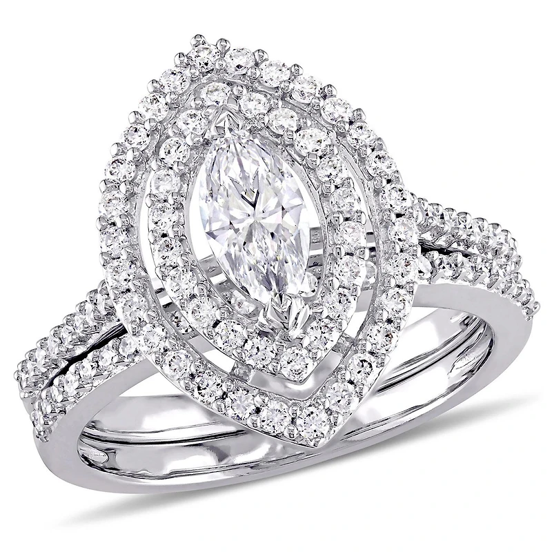 This dazzling 1 CT Marquise and Round Diamond Bridal Set is crafted in luxurious 14k white gold, combining elegance with unique design. The engagement ring features a stunning marquise-cut diamond as the centerpiece, its elongated shape enhancing the finger's grace. Surrounding it are shimmering round diamonds that accentuate the beauty of the marquise stone and continue down the band. The accompanying wedding band is adorned with round diamonds, perfectly matching the engagement ring for a cohesive, radiant look. The 14k white gold setting enhances the brilliance of the diamonds, making this set a captivating symbol of everlasting love.