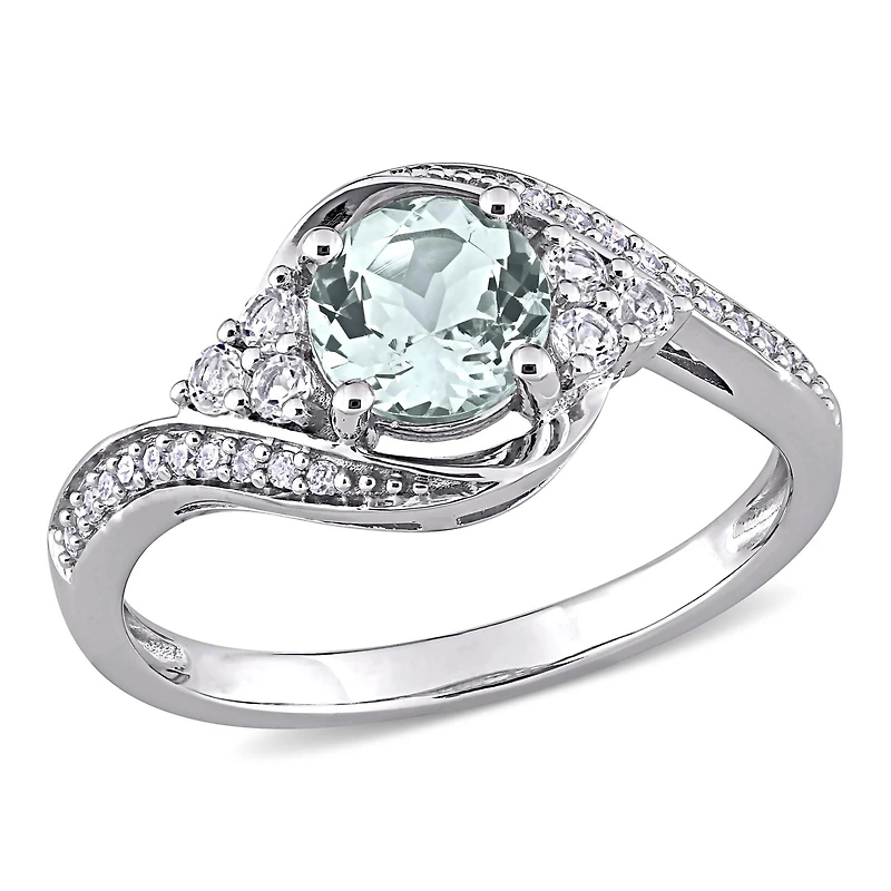Add this glittering Aquamarine, White Topaz and Diamond Swirl Ring to your jewelry collection today and look stunning. Crafted in lustrous white gold, it features a round-cut, prong-set aquamarine gemstone (6 x 6mm) at the center with six round-cut, prong-set white topaz gemstones and 22 round-cut, pave-set diamonds (G-H, I2-I3) resting on the sides and along the band. Enhanced with a high polish finish, this gemstone and diamond ring makes the perfect addition to any jewelry collection. This fabulous gemstone and diamond design can be worn seamlessly with your other rings and will coordinate beautifully with your favorite accessories.