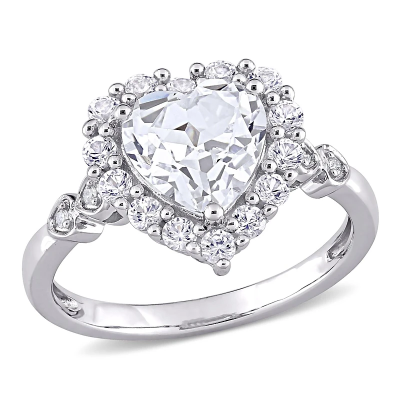 This shimmering created white sapphire and diamond teardrop halo engagement ring is crafted in white gold and features a heart-cut, prong-set created white sapphire gemstone at the center with a halo of 14 round-cut, prong-set created white sapphire gemstones and four round-cut, pave-set diamond-accents in a gorgeous gemstone bridal design. A modern take on a classic bridal style this gemstone and diamond ring is a perfect choice for the woman you love as you celebrate this special milestone and begin the next chapter of your lives together.