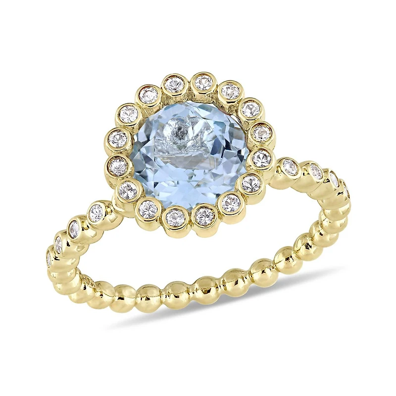 Show off with this stunning Sky-Blue Topaz and White Sapphire Halo Engagement Ring crafted in luminous yellow gold. This exquisite ring showcases a round-cut, bezel-set sky-blue topaz gemstone (8 x 8mm) at the center surrounded by 26 round-cut, flush-set white sapphire gemstones forming a halo and along the band. This stylish gemstone engagement ring gives a look of lavish style and is sure to make her say "I do."