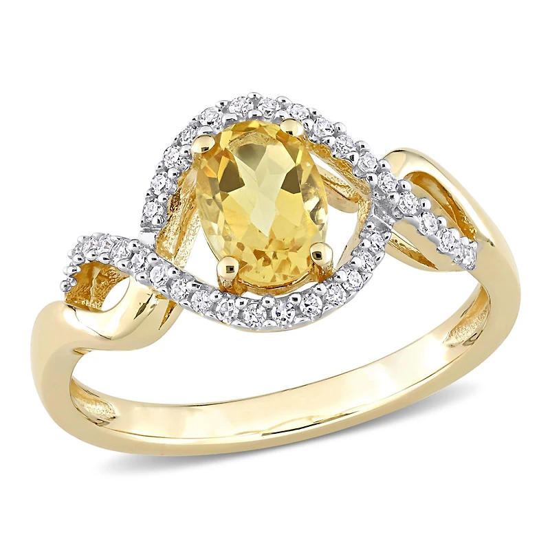 This sophisticated halo infinity ring is crafted in lustrous 10 karat yellow gold. This modern crossover ring features an oval-cut citrine center stone surrounded by a halo of round-cut sparkling diamonds and additional diamonds decorating the split shank band. Elegance and style at its finest, this November birthstone and diamond ring is sure to make a standout addition to any jewelry collection.