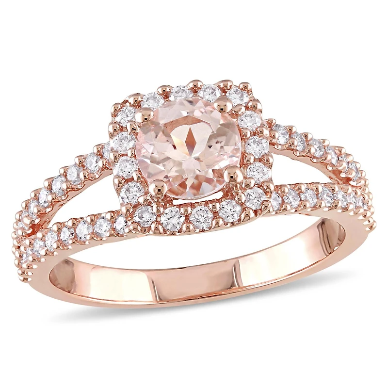 Declare your everlasting love with this one-of-a-kind halo engagement ring which features a blistering round-cut morganite center stone and eye-catching round white diamond side stones set on a split shank. This exquisite ring is crafted in lustrous 14-karat rose gold and is enhanced with a high polish finish.