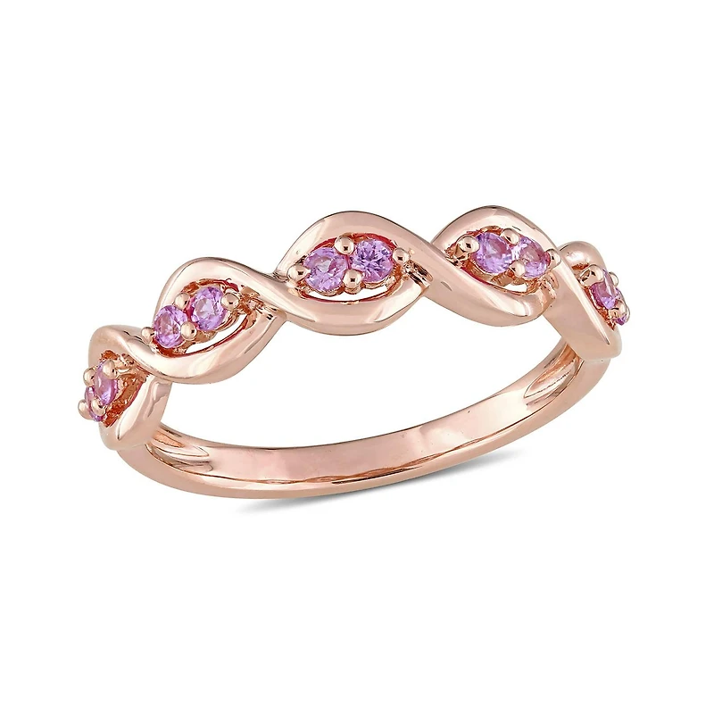 This anniversary ring is crafted in 14 karat rose gold and features sparkling pink sapphires in a studded infinity design all along the top portion of the band. This stunning ring will make a versatile addition to any jewelry collection.
