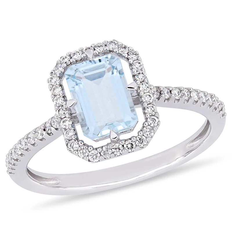 This unique aquamarine and diamond floating halo ring is crafted in 14-karat white gold and features an octagon-cut, prong-set aquamarine at its center with 48 round-cut, buttercup-set gleaming diamonds in a floating halo as well as studded along its band. Whether worn as an engagement ring or simply a gorgeous gemstone addition, this ring is sure to add a touch of elegance and style to any ensemble.