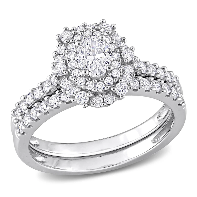 This exceptional bridal set showcases a 1/3-carat oval-cut diamond surrounded by a scintillating array of round diamonds on the engagement ring. More round diamonds sparkle down the band and along the matching wedding band. The set is crafted in cool 14K white gold and has a total diamond weight of 7/8 carat.