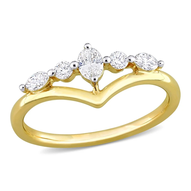 Add a chic piece to your collection with this dainty ring. Crafted in luminous 14k yellow gold, this splendid ring features one central oval-cut, diamond with two marquise-cut and two round-cut prong-set diamonds (G-H, I1-I2) mounted on either side of the stone supported by a V-shaped base. Enhanced with a polished finish, this multi-shape diamond ring is perfect for a feminine look.