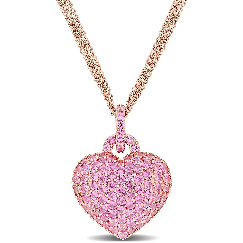 Introducing our romantic and captivating 3 1/2ct TGW Created Pink Sapphire Heart Pendant with Triple-Strand Chain in Rose Plated Sterling Silver – a symbol of love and elegance. This pendant features a heart-shaped centerpiece adorned with created pink sapphires, totaling 3 1/2 carats, set in a warm and radiant rose-plated sterling silver setting. The pendant is gracefully suspended from a triple-strand chain, measuring 17 inches in length. Elevate your ensemble with the sparkling allure of created pink sapphires, marking moments with everlasting sophistication and grace.