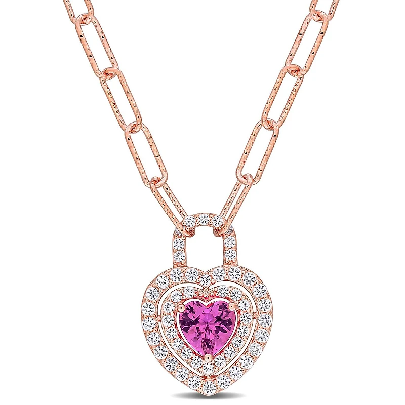 Introducing our exquisite 1 3/4ct TGW Created Pink Sapphire & Created White Sapphire Double Halo Heart Lock Paperclip Necklace in Rose Plated Sterling Silver - a captivating blend of romance and sophistication. This necklace features a heart-shaped lock pendant adorned with a double halo of created pink sapphires and created white sapphires, set in a luxurious rose-plated sterling silver setting. The pendant is elegantly suspended from a trendy 16-inch paperclip chain. Elevate your ensemble with the sparkling allure of sapphires, marking moments with everlasting sophistication and grace.