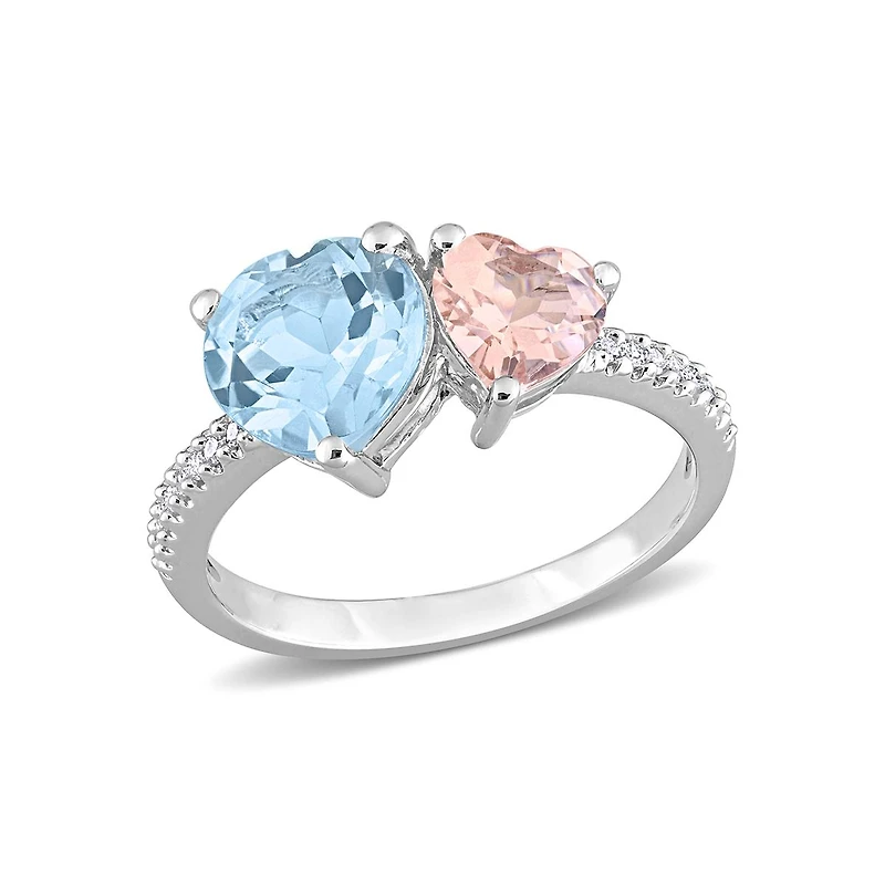 Add a cute and adorable accessory to your collection with this flattering ring. Crafted in lustrous sterling silver, this gorgeous ring showcases one heart-cut prong-set sky blue topaz, one heart-cut prong-set morganite gemstone, and 16 round, buttercup-set diamonds studded along the edges of the sleek band. Enhanced with a polished finish, this is ideal for layering.