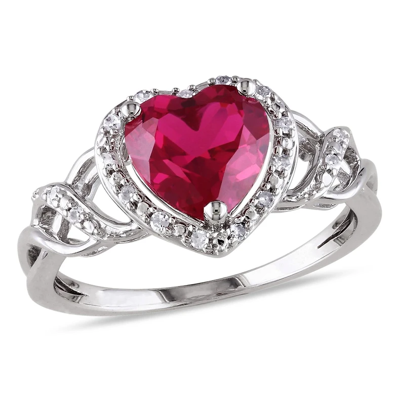 This lovely ring features a heart-cut created ruby center stone and round white diamond side stones. This beautiful ring is crafted of fine sterling silver with a high polish finish.