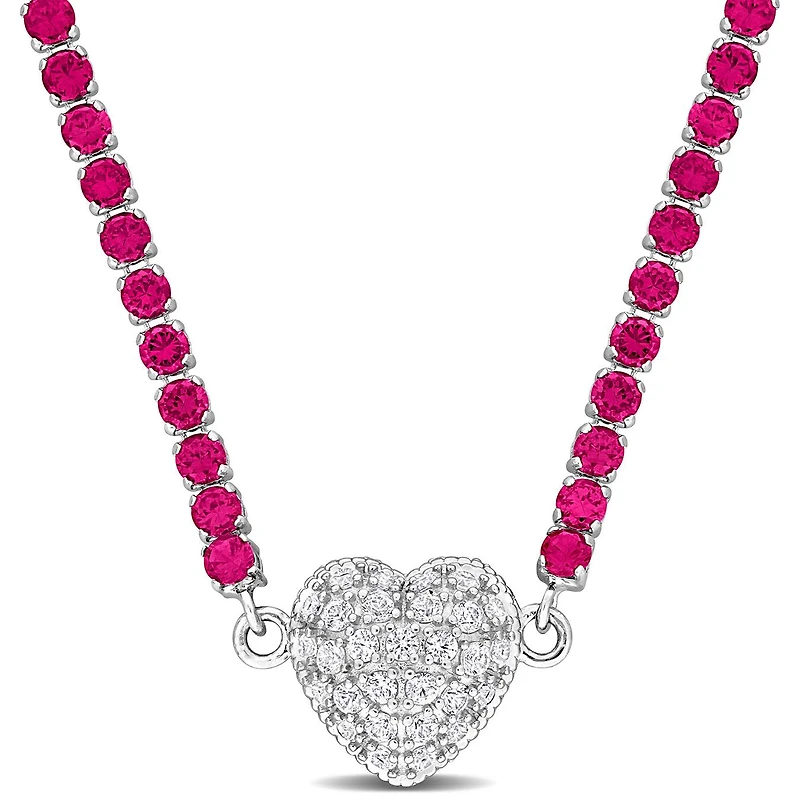 Make a bold statement with this striking heart necklace adorned with created ruby and white sapphires. Crafted in sterling silver, this necklace measures 17 inches, exuding sophistication and charm. Its rich gemstones and romantic design make it a perfect accessory for special occasions or evenings out, adding a touch of glamour to any ensemble.