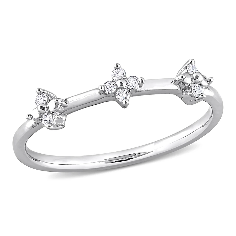 Express your love and devotion with this Diamond Triple Floral Promise Ring. Crafted in lustrous sterling silver it features eight round-cut, prong-set diamonds (H-I, I3) augmented in triple floral cluster in an alternate motif on the shank. Display your commitment with this gorgeous triple floral ring. Buffed with luster, this luminous ring is the perfect addition to any jewelry collection.