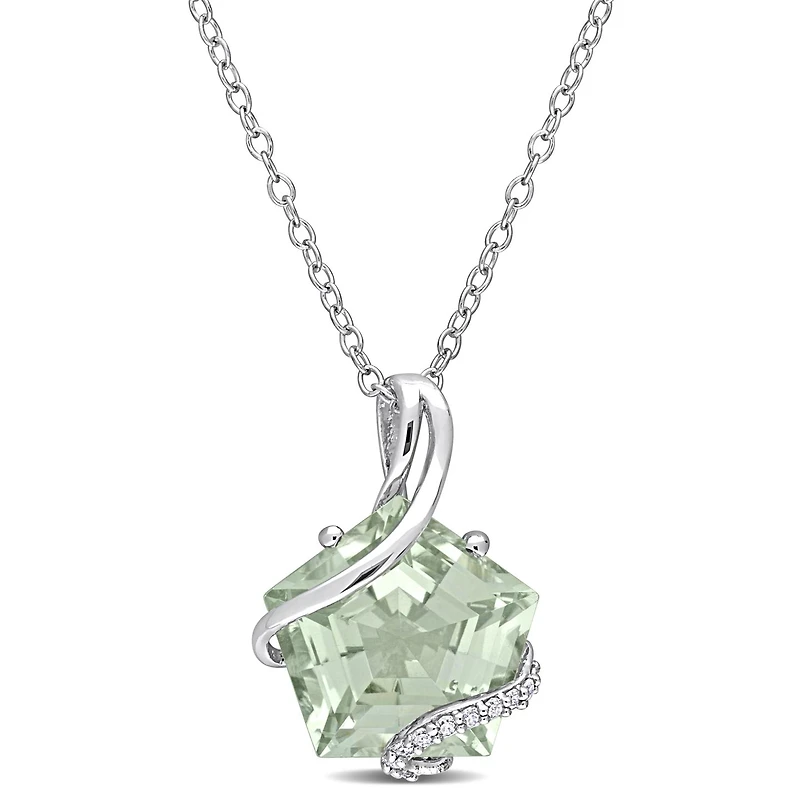 This fancy-cut green amethyst swirl necklace is crafted in sterling silver and features a fancy-cut green amethyst and 11 round-cut diamonds in a unique swirl design. Enhanced with a high polish finish, this lovely pendant is hung on an 18-inch cable chain and secured with a spring ring clasp. This pretty gemstone and diamond necklace makes a perfect gift either for yourself or for someone you love. A beautiful addition to any jewellery collection.