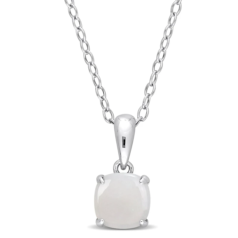 Inspire jewellery designers with this enchanting Opal Solitaire Pendant with Chain. Crafted in luminous sterling silver, this classy pendant features a princess-cut, 4 prong-set opal gemstone (6x6mm) in a classic basket setting. Polished to a brilliant shine, this elegant pendant is suspended on an 18-inch round cable chain secured with a spring ring clasp. This splendid pendant will be a symbol of peace and calmness.