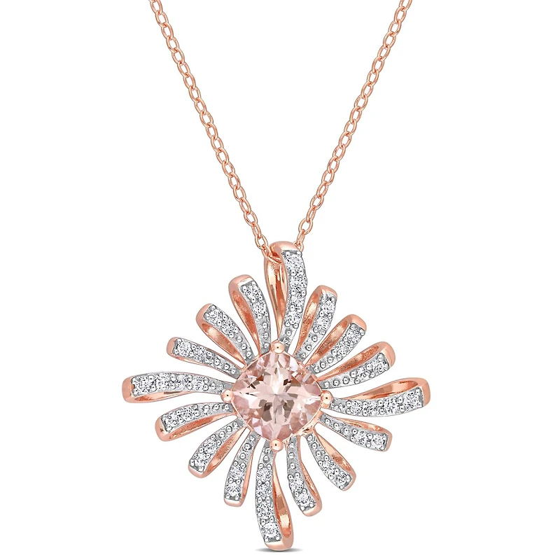 This charming floral pendant is mounted in luminous rose plated sterling silver. This striking pendant showcases a cushion-cut, prong-set morganite gemstone at the centre surrounded by 40 round-cut, prong-set white topaz gemstones. Polished to a brilliant shine, this exquisite pendant is suspended on an 18-inch round cable chain. Accentuate your neckline with this ravishing pendant and feel stylish.
