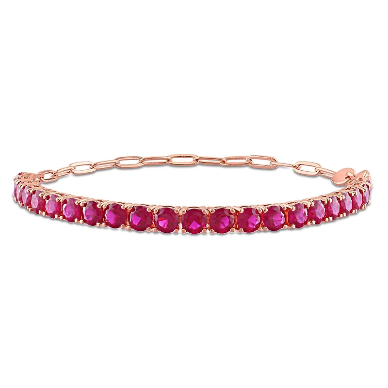 This elegant tennis bracelet is crafted in lustrous rose plated sterling silver. This appealing bracelet features 19 red cubic zirconia gemstones placed in a semi-eternity pattern with an oval link chain. Enhanced with a high polished finish, this captivating 7.5-inch bracelet is sure to make you standout in the crowd. Add some colour to your party dress with this classy bracelet.