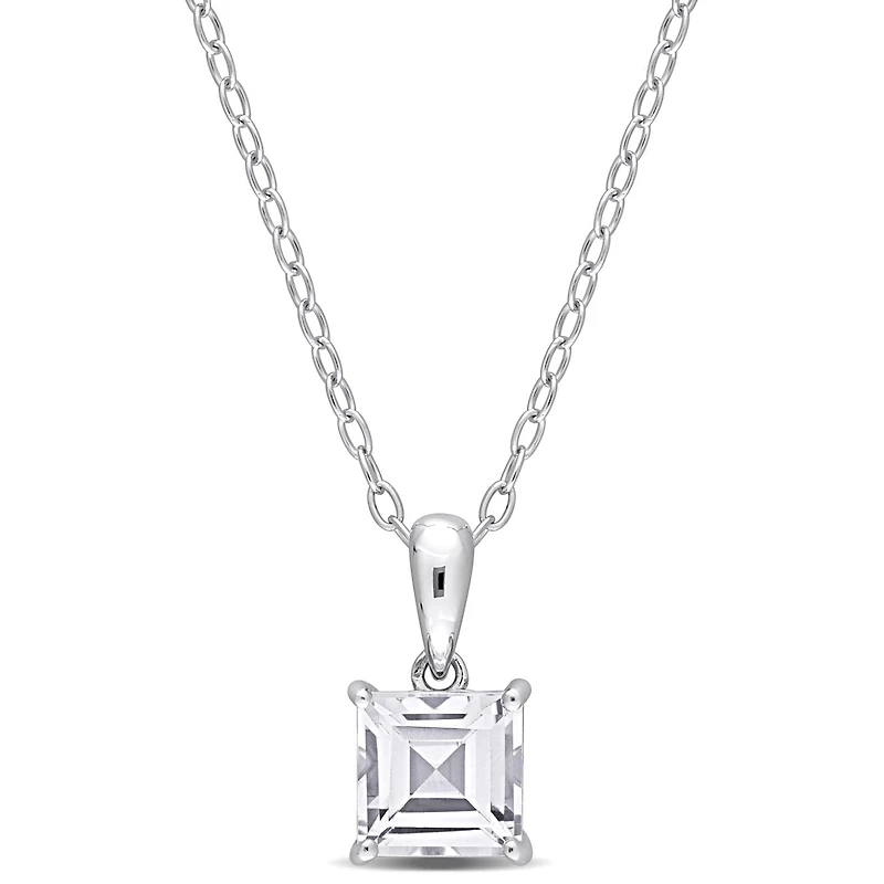 Stun her with your classy choice of this White Topaz Solitaire Pendant with Chain. Crafted in glistening sterling silver, this charming pendant features a princess-cut, 4 prong-set white topaz gemstone (6x6mm) in a classic basket setting. Polished to a brilliant shine, this flawless pendant is suspended on an 18-inch round cable chain secured with a spring ring clasp. This exquisite pendant will mean much more to her than just a neckpiece.