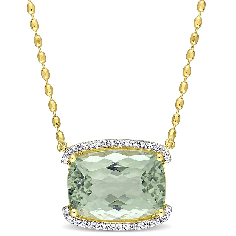 This opulent semi-halo pendant with a chain is crafted in lustrous yellow-plated sterling silver and features a cushion-cut prong-set green quartz (18x13mm) encased in a semi-halo design created by 32 round-cut prong-set white topaz (1.2x1.2mm) gemstones. Enhanced with a polished finish, this splendid pendant is suspended on an 18-inch diamond cut bead chain secured with a lobster clasp. This necklace is a perfect balance between classic and contemporary.