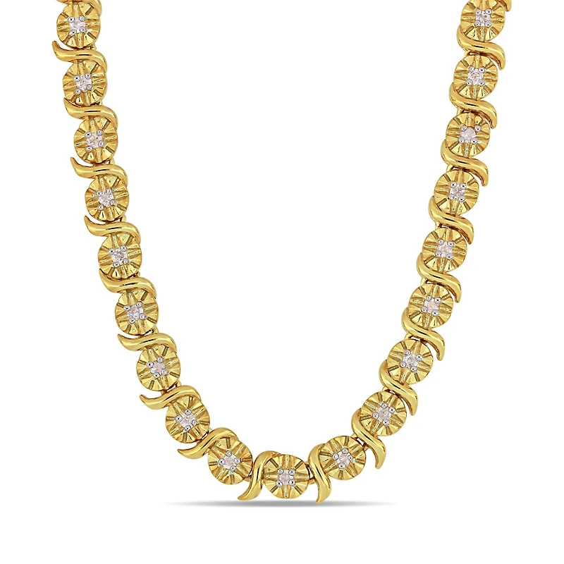 This lustrous swirl diamond tennis necklace is crafted in yellow plated sterling silver and features 35 round-cut, prong set glistening diamonds in a unique S-link design, perfect to grace all occasions. Instantly add a touch of elegance, sophistication and class to any ensemble with this stunning diamond necklace. A perfect versatile choice either for yourself or as a special gift for someone you love.