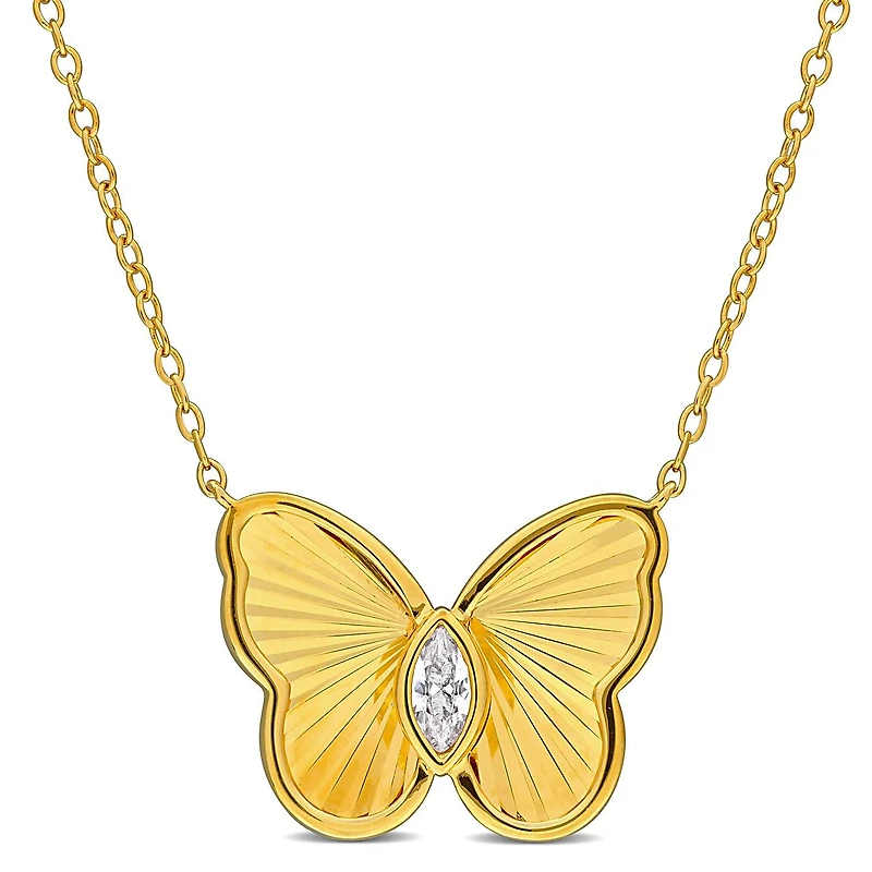 Illuminate your style with the delicate beauty of the 1/5ct TGW Marquise-Cut Created White Sapphire Butterfly Necklace in Yellow Plated Sterling Silver. This enchanting necklace features a graceful butterfly design adorned with marquise-cut created white sapphire gems, exuding elegance and charm. With a fixed length of 17 inches, it sits perfectly on the neckline, adding a touch of whimsy to any outfit. Elevate your look with the timeless allure of this exquisite accessory.