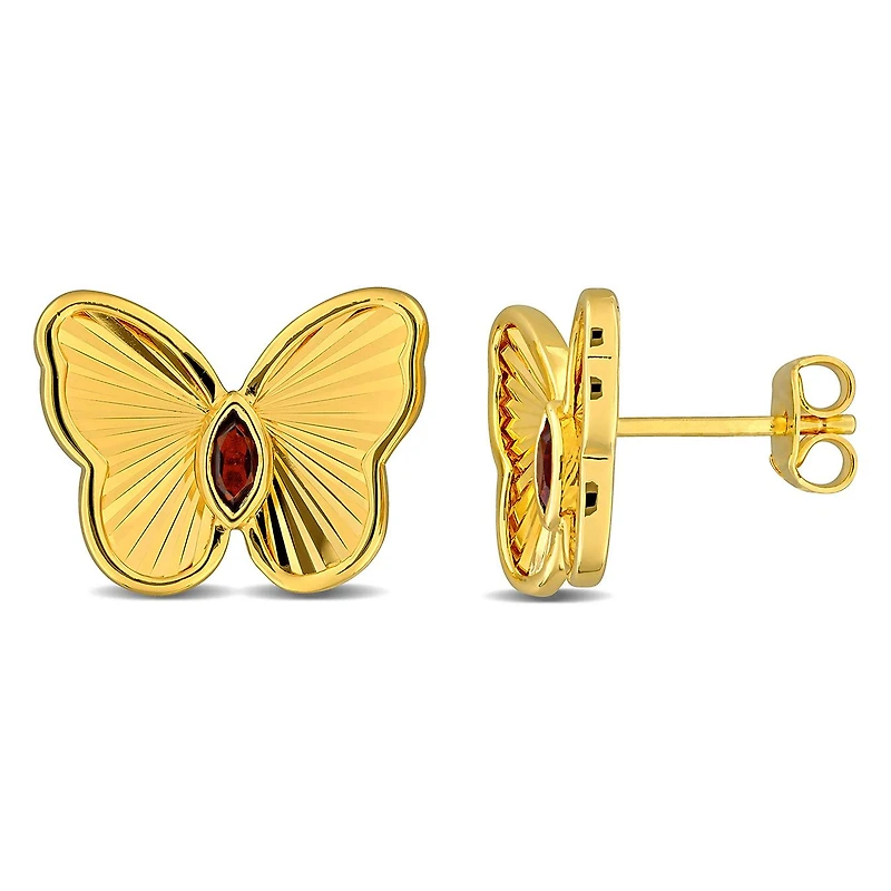 Adorn your ears with whimsical charm with these enchanting 1/5ct TGW Marquise-Cut Garnet Butterfly Stud Earrings, elegantly crafted in Yellow Plated Sterling Silver. The intricate marquise-cut garnets form delicate butterfly wings, adding a touch of playful elegance to any ensemble. Perfect for adding a pop of colour to your look, these earrings are a delightful choice for both daytime and evening wear. Embrace the beauty of nature and the brilliance of garnets with these exquisite studs that effortlessly blend femininity and sophistication
