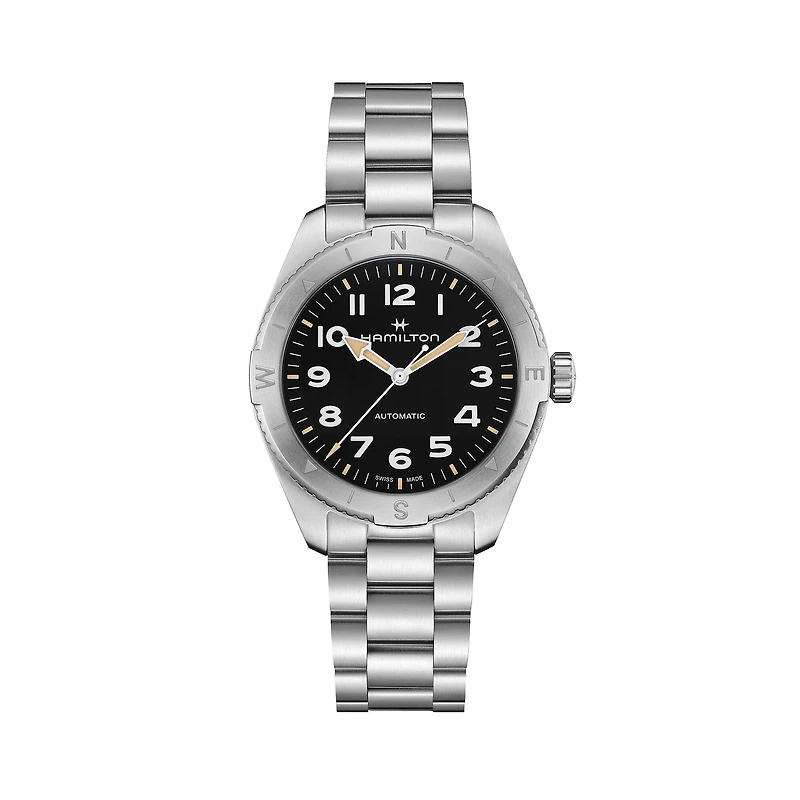 Gear up for the great outdoors with the Khaki Field Expedition, an all-terrain adventure watch with a compass design enabling you to navigate your adventure with the help of the sun. Housed in a 37mm stainless steel case paired with a matching bracelet, it is equipped with a screw-down crown to protect the movement no matter the weather. Featuring a black textured dial with Super-LumiNova® coating for ultimate legibility, the Khaki Field Expedition is tough when you need it.