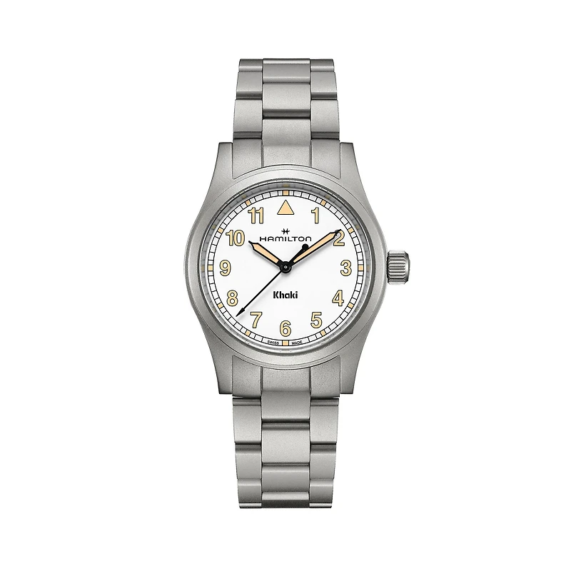 Primed for adventure, the Khaki Field Quartz is a reliable and rugged companion ready for exploration. Taking inspiration from Hamilton's reputation for precision, innovation and utility-focused design, the Khaki Field Quartz pairs a clean white 38mm dial with a modern metal bracelet. Discover our Khaki Field collection.