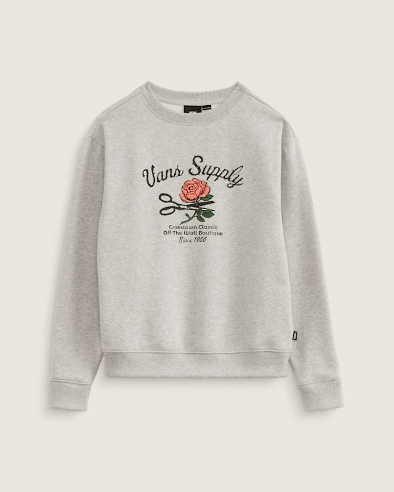 Make a thorny statement in the Kids Supply Boutique Crew Sweatshirt, a roomy long-sleeve crew neck sweatshirt with a thorny Vans Supply graphic and a rose with scissors on the front.