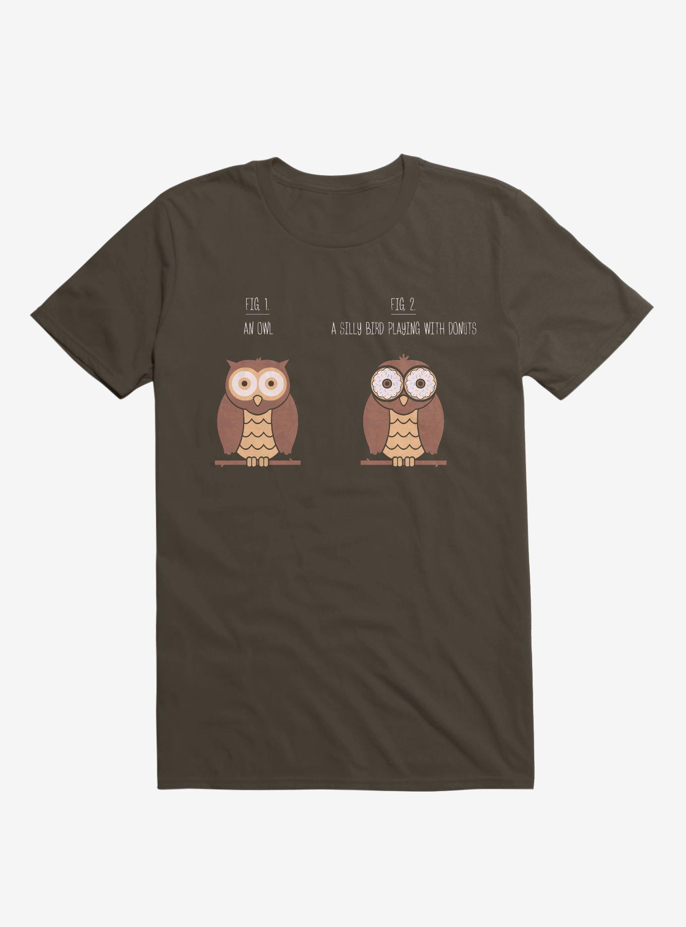Question for you amateur bird watchers out there. How can you tell the difference between an owl - and a silly bird playing with donuts? This lightweight brown tee makes it clear. Officially licensed art from handsoffmydinosaur.