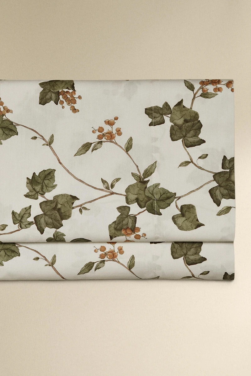 Flat sheet in 200-thread-count cotton percale with a leaf print.
