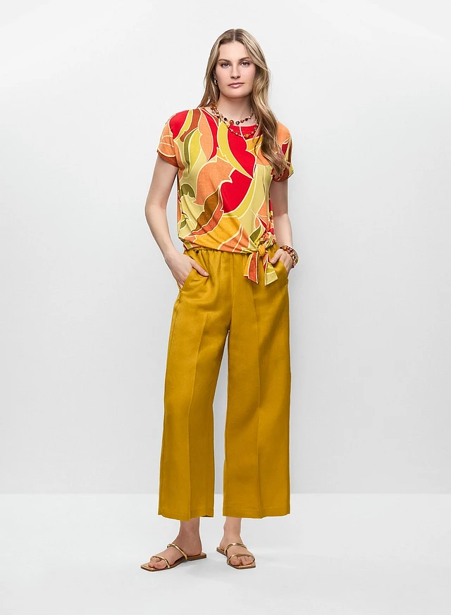 Leaf Print T-Shirt & Linen-Blend Culotte Pants