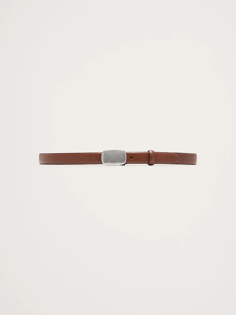 Like a streamlined take on a Western classic, this sturdy leather belt has beautifully burnished edges and a minimalist plaque buckle.