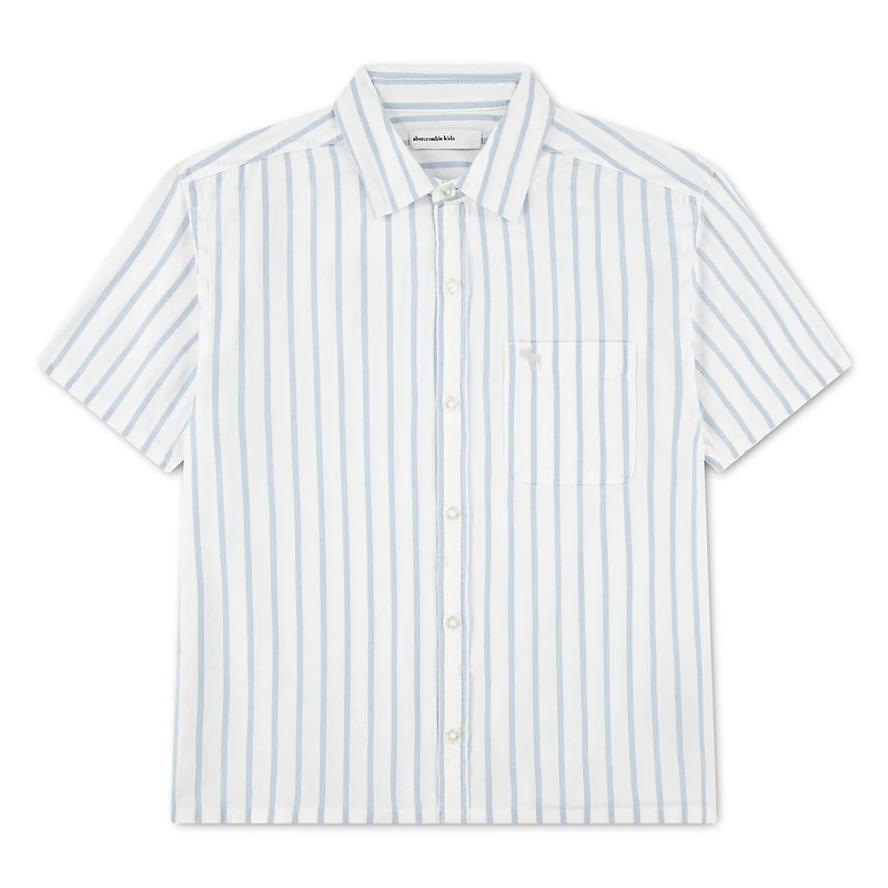 This woven cotton shirt from abercrombie kids is a wardrobe staple comfy enough for all-day wear finished with an allover stripe print. It features a button-front placket, a chest pocket, and can be styled open over a tank or tee or worn buttoned, on it's own.