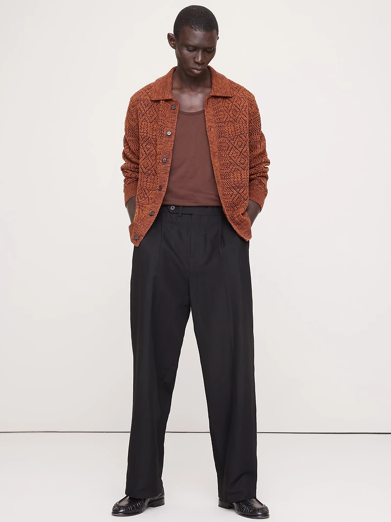 So retro yet so now, we crafted this polo cardigan with an open, pointelle stitch to create a geometric pattern for this soft sweater knitted from cotton and linen. Standard fit: A straight and easy fit. Polo collar with button front. Straight hem.