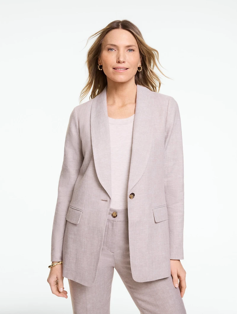The epitome of luxe comfort. Our relaxed blazer is elevated with a shawl collar for polished layering. Crafted from breathable linen with chic flap pockets. Ready to elevate your office and weekend looks.