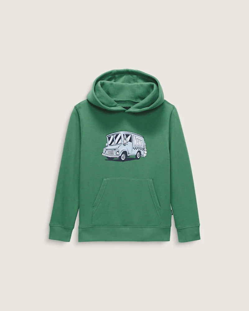 The Little Kids Free Shipping Pullover Hoodie is a classic pullover hoodie made of warm and cozy brushback fleece. It also features ribbed details with a screenprinted graphic of a delivery van with a Vans® logo on the front.