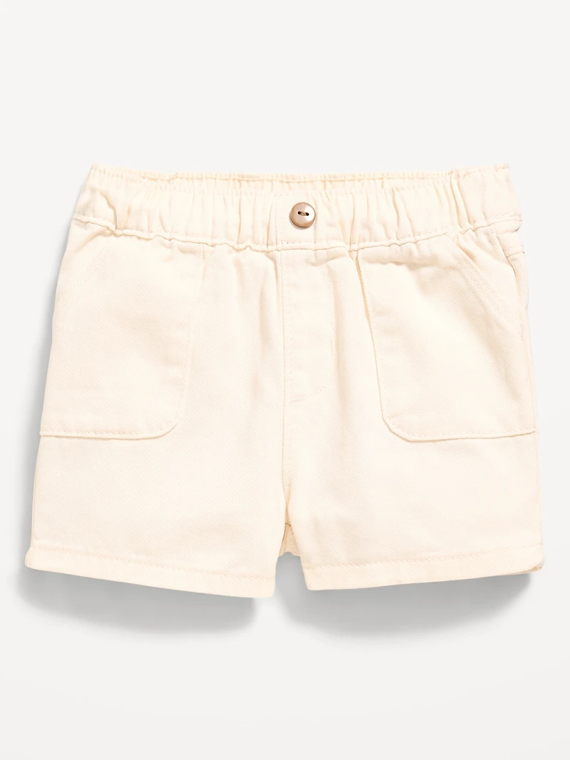 elasticized waistband decorative button closure diagonal utility pockets back patch pockets