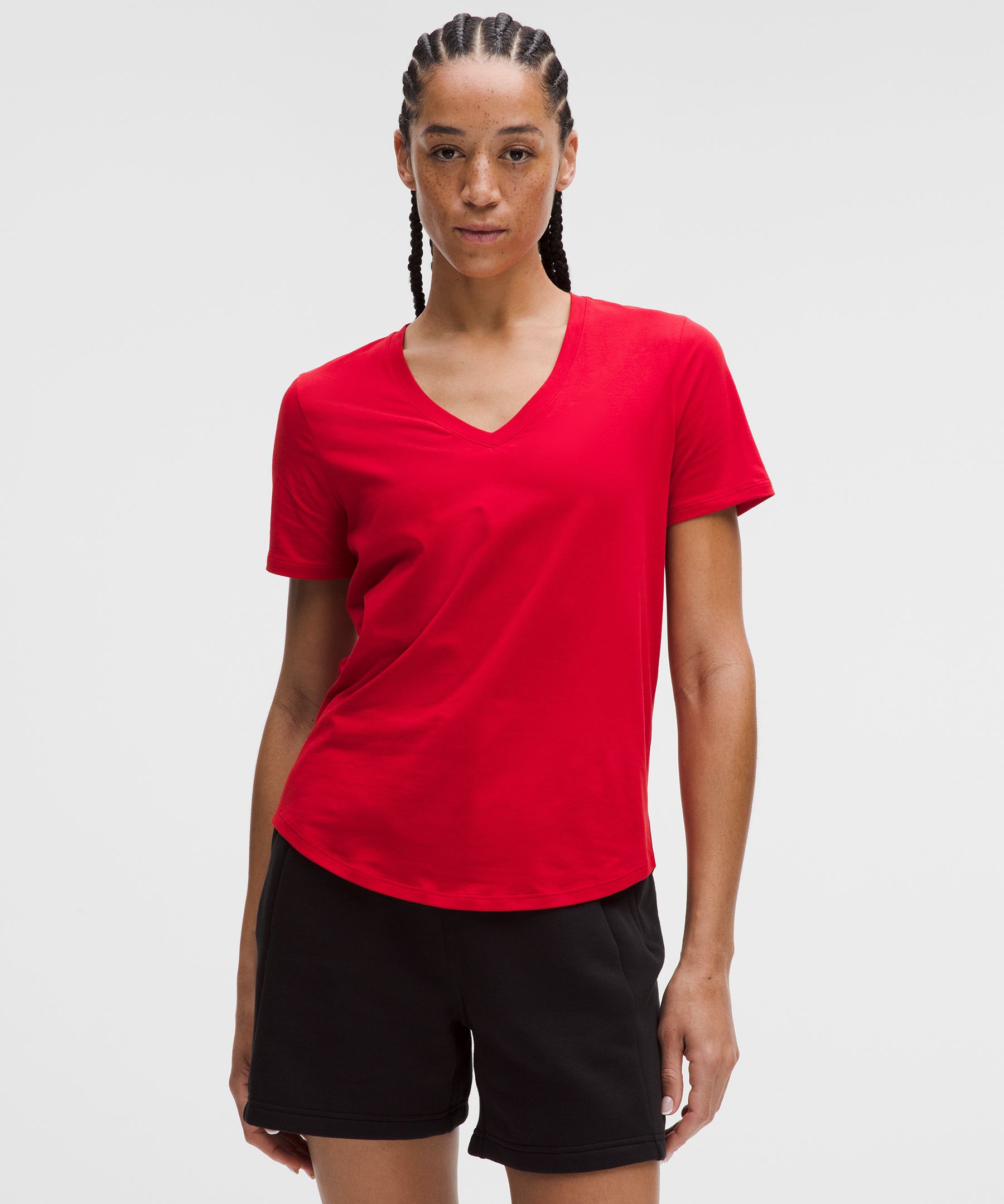 Lots of reasons to love this tee. Soft cotton fabric, a hint of stretch, and a just-right curved hem that pairs perfectly with leggings.