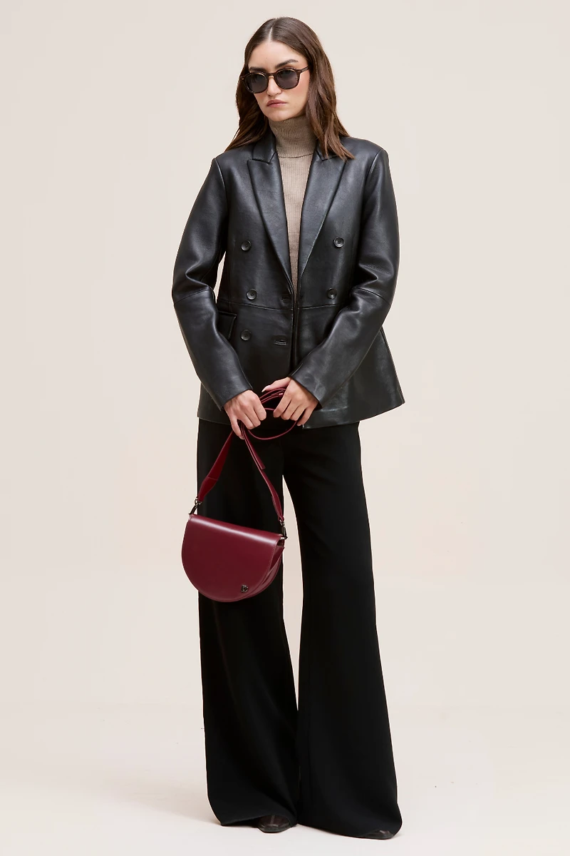 brings a modern luxury update to a timeless silhouette. This double-breasted leather blazer design features sharp tailoring, sculpted seams, and classic flap pockets for a polished finish.