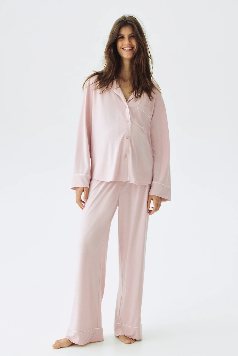 Pajama shirt and pants, both in soft jersey with delicate piping. Shirt with a resort collar, buttons at front, and an open chest pocket. Pants with soft elastic at waistband for added comfort during and after pregnancy.