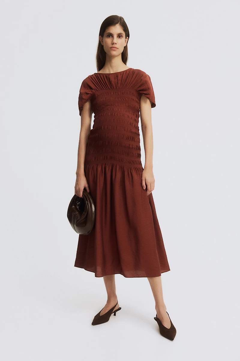Short-sleeved, ankle-length dress in a woven viscose blend with a boat neck. Generous gathers at upper section, wide smocking at midsection, and generous gathers in skirt. Unlined.