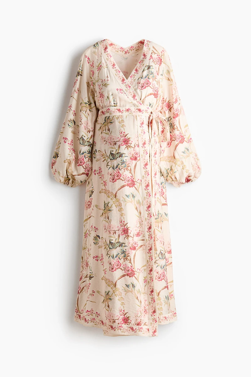 Ankle-length dress in a woven viscose blend with a printed pattern. Low-cut, V-shaped neckline, wrapover front, tie belt at waist, and a gathered seam at back of waist. Long raglan balloon sleeves with narrow elastic at cuffs. Unlined.